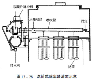 由于濾芯本身是一個(gè)硬固體,不再配置骨架,所以濾芯的清灰與傳統(tǒng)的濾袋清灰不同。圖13—28所示是用一個(gè)脈沖閥噴吹三個(gè)排在一起的濾芯。濾芯的總過濾面積應(yīng)有限制。
