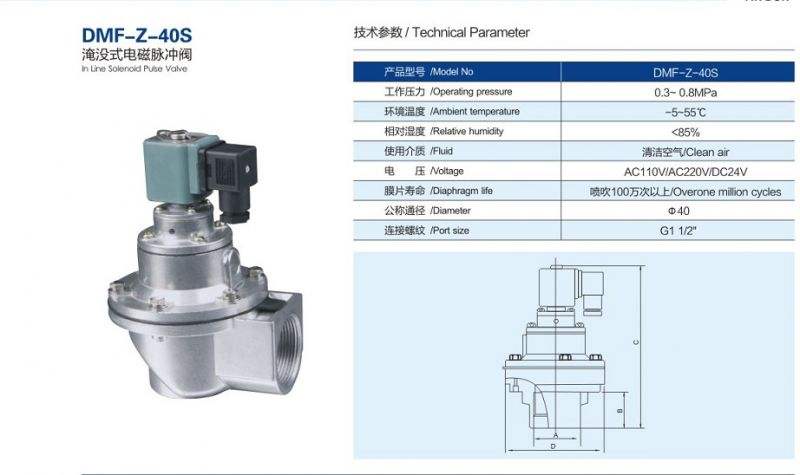 40S直角電磁脈沖閥為1.5寸脈沖閥,除塵器上常用來噴吹2.5米長布袋,噴吹布袋數量可以根據實際噴吹壓力和濾袋材質來決定。