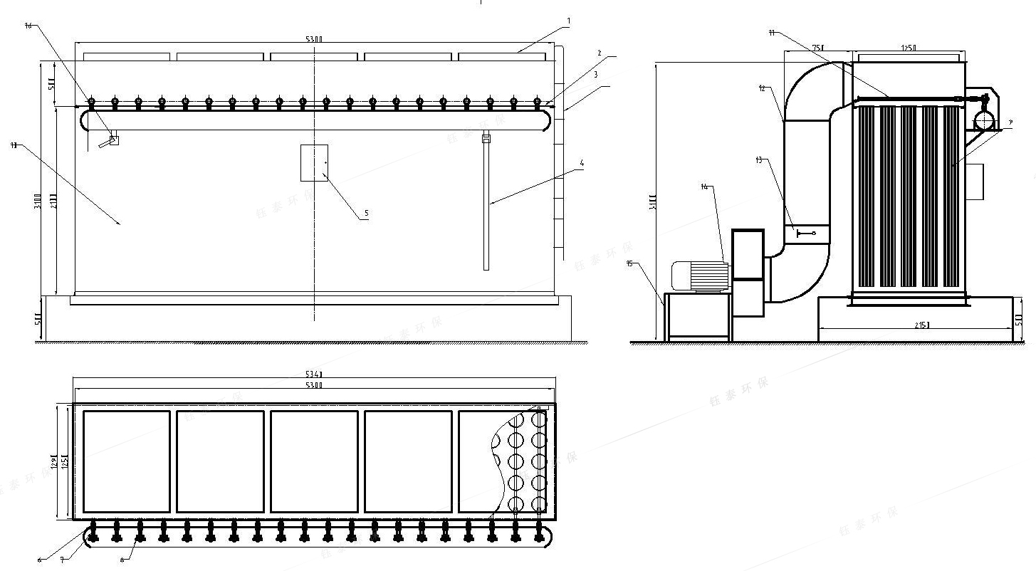 改造后,灰?guī)斓拿繂闻_庫頂布袋除塵器技術(shù)參數(shù):處理風(fēng)量17000m3/h、過濾風(fēng)速1.0m/min、過濾面積240m2,濾袋耐溫135℃、抽塵風(fēng)機出口含塵濃度≤10mg/Nm3。除塵器外型尺寸為原除塵器外殼尺寸:5.3×1.25×3.1m(高)